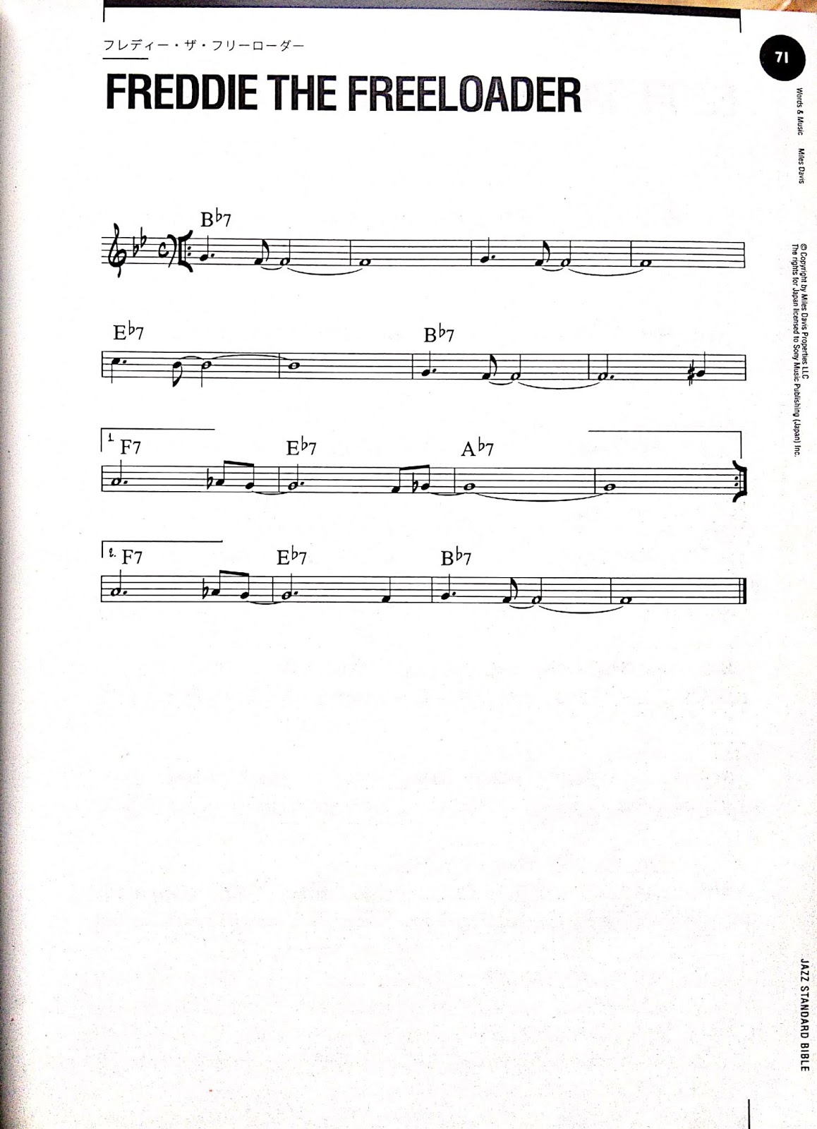 ■Four 黒本1 P-69 ・アナライズ譜 [A] ・EbMaj7 で始まり ⇒ Modal Interchange で Ebm7 からの 2-5-1 で、 解決先の I (DbMaj7) に解決せず、Ab の同主調 AbMaj7 に行く ・AbMaj7 で始まり ⇒ Modal Interchange で Abm7 からの 2-5-1 で、 解決先の I (GbMaj7) に解決せず、[B] に行く [B] ・Eb で始まり ⇒ 半音上に転調 Key=E の 2-5 (F#m7 - B7) で E に解決せず、 Key=Eb に戻って 2-5 (Fm7 - Bb7) で Eb に解決。 ・Eb で始まり ⇒ 半音上に転調 Key=E の 2-5 (F#m7 - B7) で E に解決せず、 Key=Eb に戻って 3-b3-5 (Gm7 - F#m7) 、 Key=Eb のまま 2-5-1 (Fm7 - Bb7 - Eb) で曲のキー Eb に解決。 yaplog での Four アナライズ記事 <原曲と参考演奏> ・原曲 ・参考演奏(ピアノトリオ) ・BIAB ・テーマの練習とスケール練習(Slow) ・テーマの練習とスケール練習(Medium) ・私たちの練習